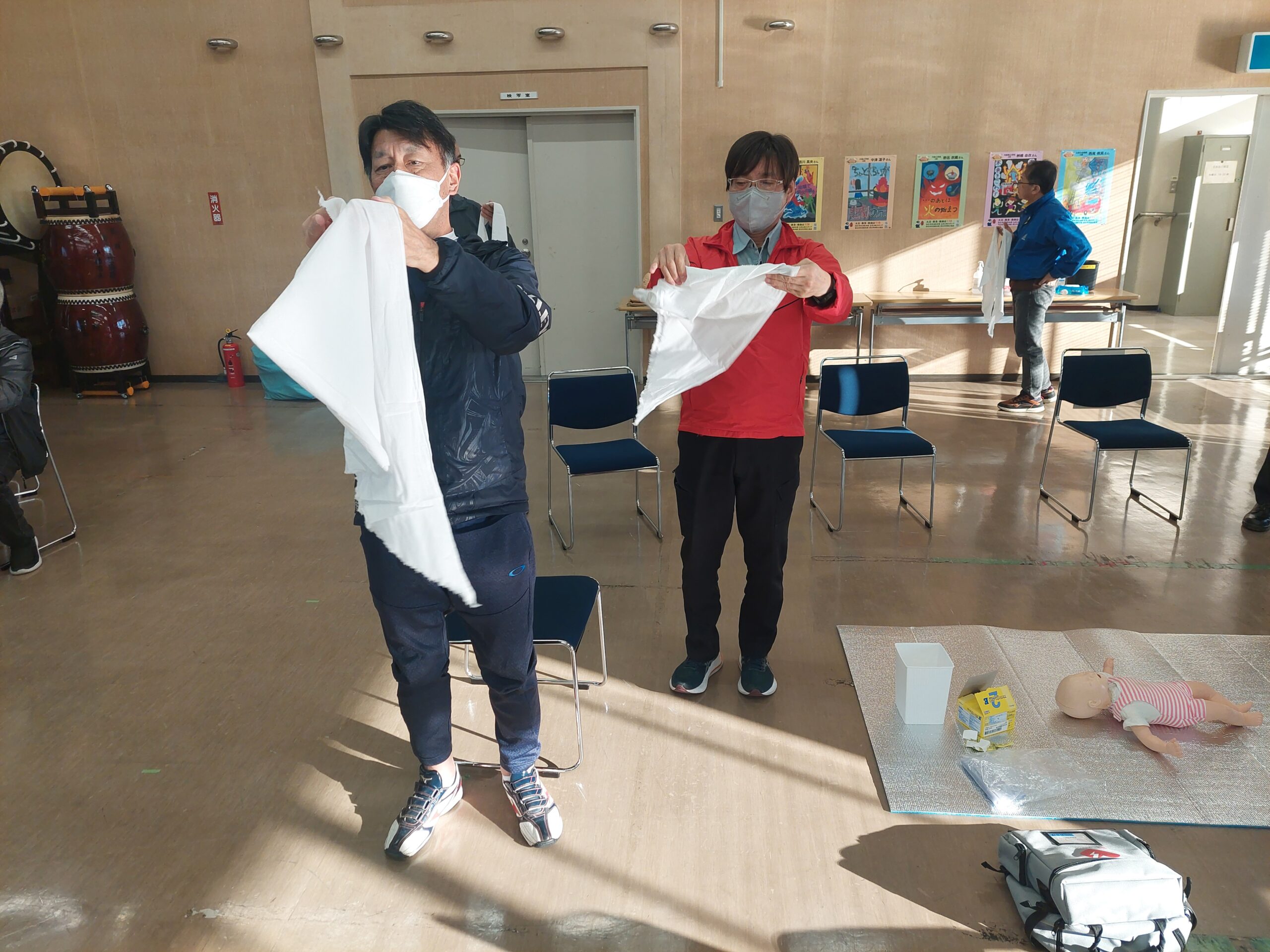 三角巾を利用した包帯で、様々な出血部位の「止血法」や骨折部位の「固定法」を学びました。