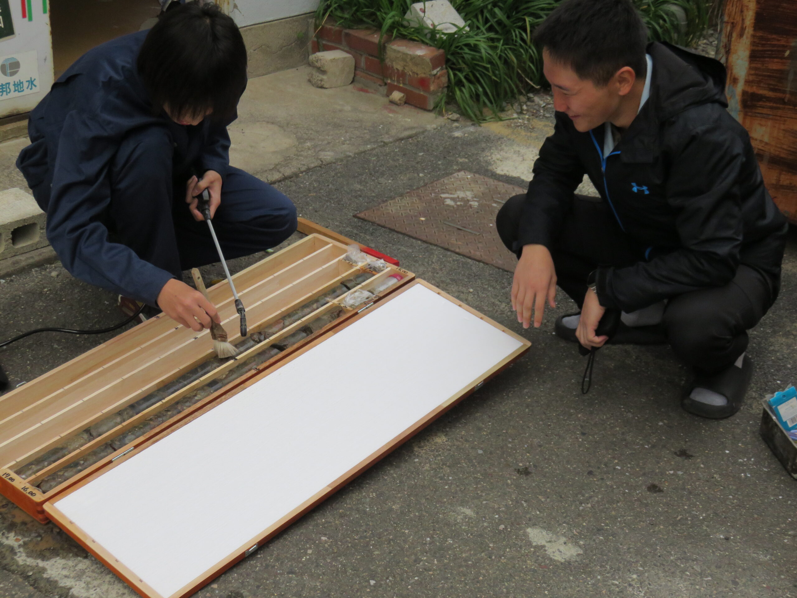 ボーリングコアの保護シートを除去した後にコア洗浄を行いました。(指導者は母校の先輩です!)