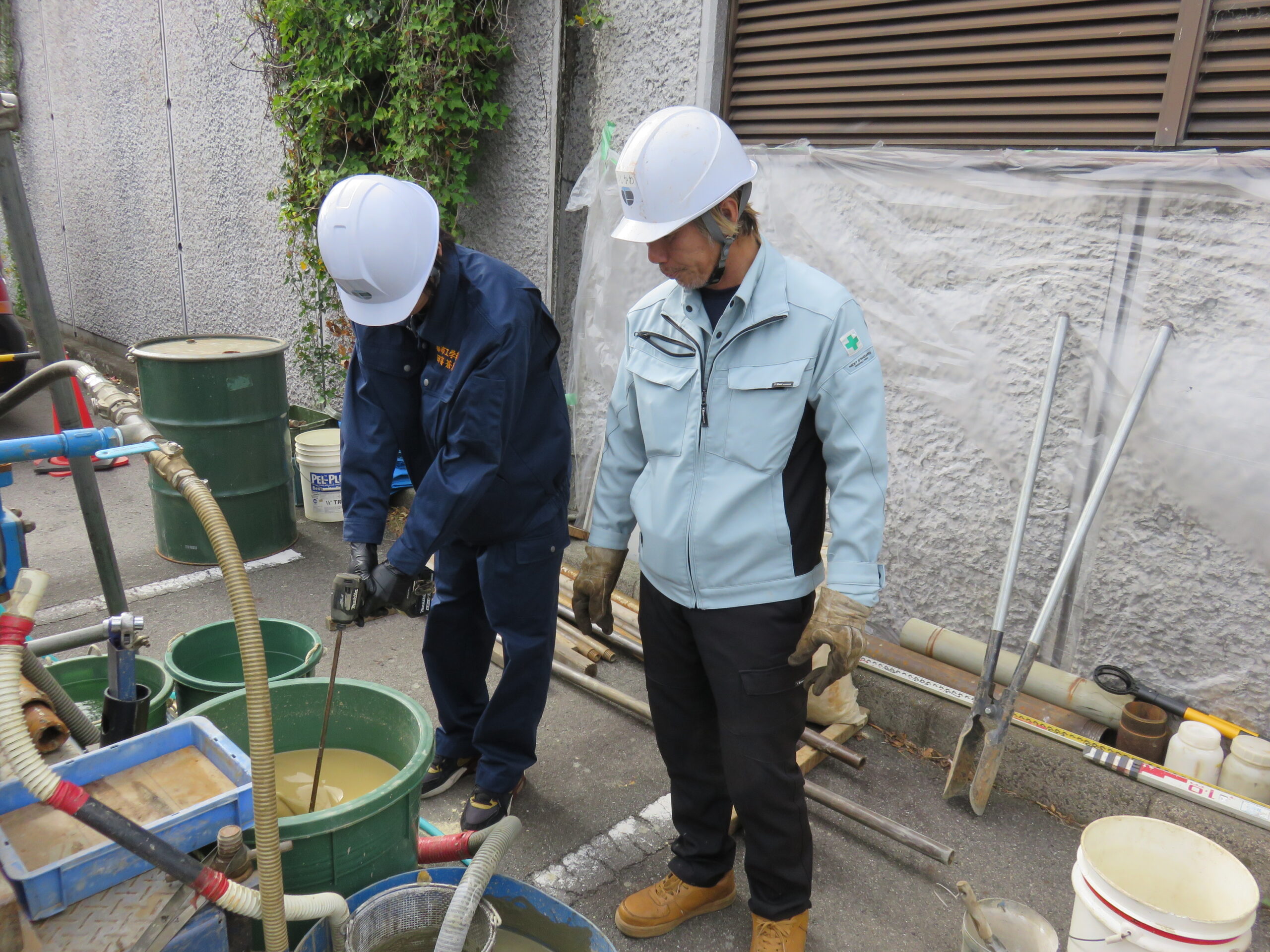 ボーリング孔壁の崩壊を防止したり、掘削屑を排除したりするのに必要なベントナイト調泥を行いました。