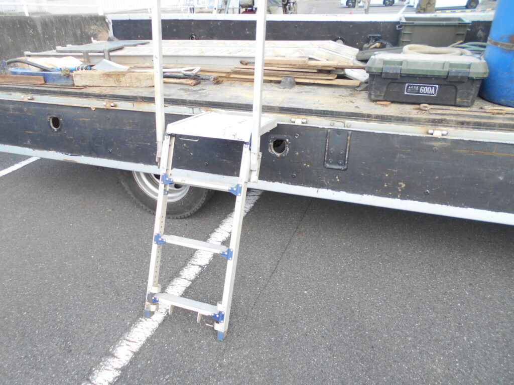 トラック荷台に昇降設備を設け、荷役作業中の転落事故を防止しています。