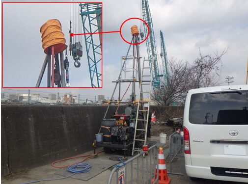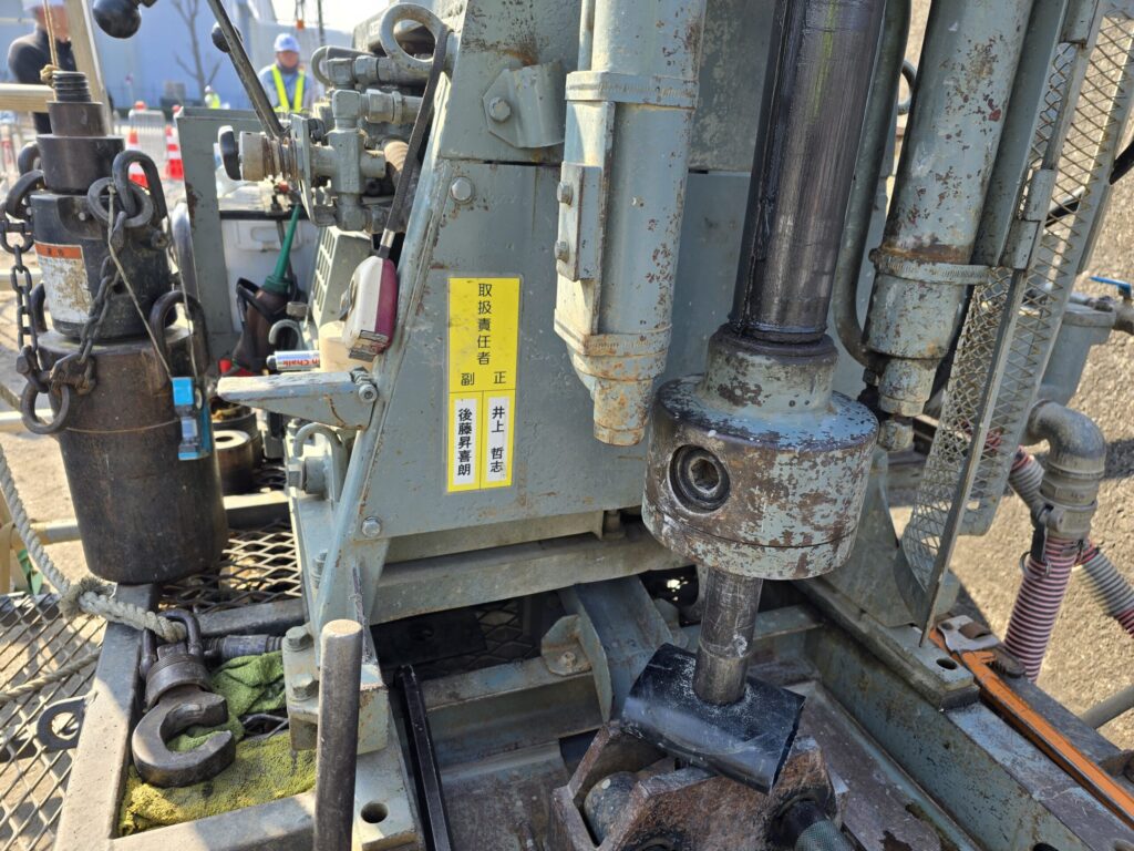 概 要:今回のパトロールは、薬液注入工法による地盤改良効果の確認を目的とした地質調査の現場です。対象深度までボーリングで削孔した後に改良部分から乱れの少ない土試料を採取して室内試験で強度を確認します。調査地点が民地(駐車場)に近接した場所のため、第三者災害の防止、強風による資材や泥水の飛散防止を重点対策項目に定めて作業を実施しています。